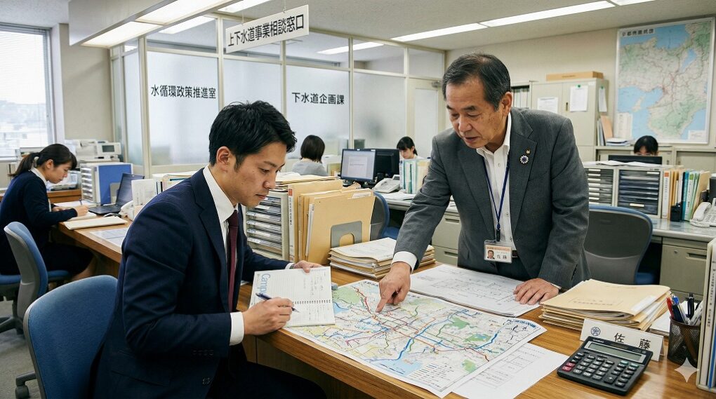 まずは物件所在地の役所へ行き、「都市計画課」「水道局」「下水道課」といった担当窓口で話を聞くことからスタートします。